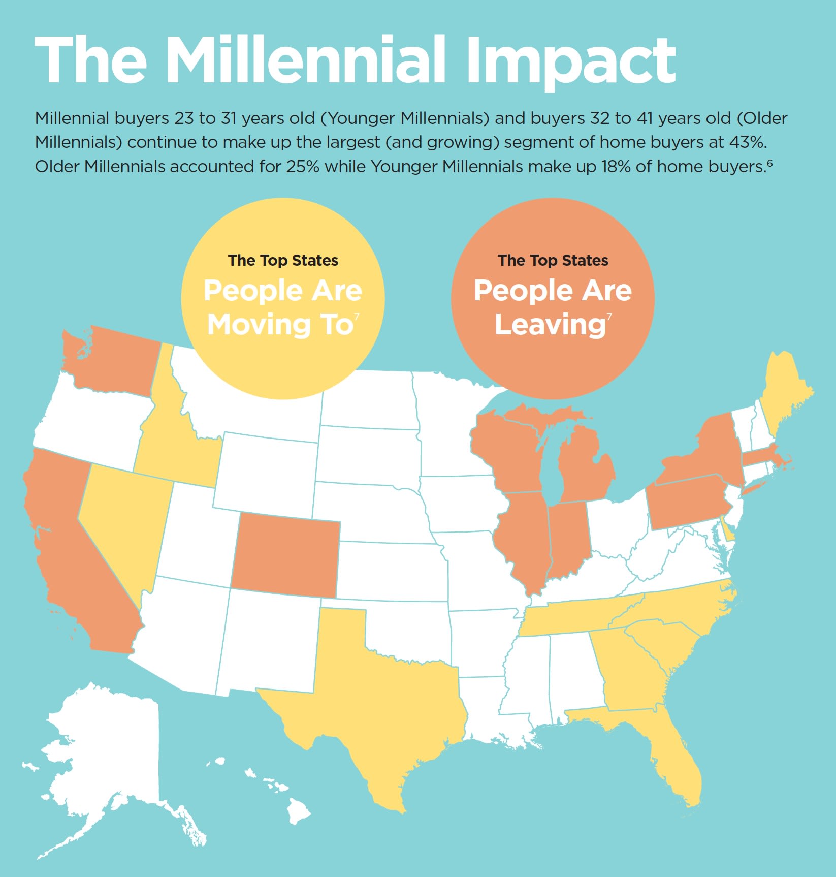 Millennial buyers 23 to 31 years old (Younger Millennials) and buyers 32 to 41 years old (Older Millennials) continue to make up the largest (and growing) segment of home buyers at 43%. Older Millennials accounted for 25% while Younger Millennials make up 18% of home buyers.